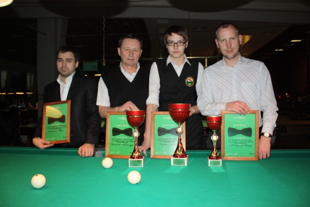 Судьи во время турниров ЛЛБ частенько выполняют двойную функцию - рефери и игрока. Я решил внести элемент новизны, и опубликовать краткий репортаж с места событий, прямо из клуба "Гермес-Меркурий", где заканчивается однодневный бильярдный триатлон, в котором я принял непосредственно участие (правда, весьма посредственное, простите за каламбур). В роли бегунов-марафонцев - доблестные питерские банкиры, которые по итогам трех предварительных туров определили 16 игроков, удостоенных почетного права разыграть звание сильнейшего в абсолютном зачете. Все, как на итоговых турнирах ЛЛБ - гандикапы, "свободная пирамида" - до 3-х, затем "комбинированная пирамида" - до 2-х, и "контровая" "динамика" - также до 2-х побед. Три семейные команды - я с Матвеем, Геннадий Ветров с сыном Евгением, и братья Максим и Александр Шорины, были "рассеяны" по разным частям таблицы. В остальном пары определил слепой жребий. А он свел в первом же раунде нескольких фаворитов турнира - Ивана Сюпкаева и Александра Беспалова, Матвея Горба и Игоря Лебедева. В первый раз победу праздновал Иван 2:1 и Матвей 2:0. Далее по сетке указанные игроки двигались с разной скоростью. Быстрее всех до полуфинала добрался наиболее активный из участников банковских турниров ЛЛБшник - И.Сюпкаев, несмотря на то, что у них с Матвеем на сегодня наиболее "жесткая" фора - от 1-го до 2-х шаров. Особенно Ваня "блицнул" в 1/4 финала, сокрушив Алексея Понкратьева минут за 30 со счетом 2:0 после длительного ожидания, которое было несколько скрашено созерцанием неслыханной дерзости: сын поднял руку...(с зажатым в ней кием) на отца, и не выпускал его (кий) из рук до самого заключительного победного шара. В роли жертвы выступил ваш покорный слуга. Что и говорить, против кладки нет приема - 2:0! Слабым утешением мне послужила одна "сухая" партия в "американку".Не повезло сегодня игроку "Номос-банка" Сергею Гуржему. Его обидчиками выступили сначала шеф - Алексей Понкратьев, а следом - Игорь Лебедев.