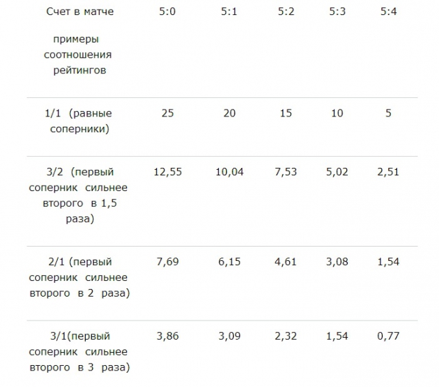Такой подсчет очков, с одной стороны, заставляет сильного спортсмена быть в форме и не расслабляться даже во встречах с менее опытным соперником, так как если он проиграет, то потеряет большее количество очков, чем более слабый по рейтингу спортсмен, за тот же проигрыш.