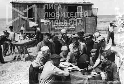Колхозники колхоза Путь социализма на полевом стане слушают радио, играют в настольный бильярд. Июнь 1939, Украина, Запорожская обл
