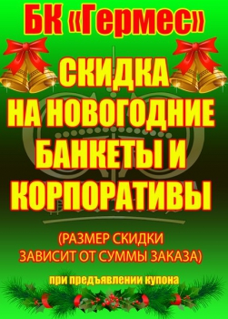 Сеть клубов «Гермес» предоставляет скидку по всей сети на новогодние банкеты и корпоративы. Для этого требуется распечатать купон и предъявить его в клубе управляющему.