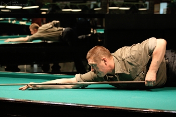 Сдается нам, что игроки, приезжающие на турниры в клуб на Заневском проспекте, ценят его, кроме всего прочего, еще и за атмосферу. Сегодня, например, здесь собралось 25 человек, жаждущих хорошей игры. Среди них оказался наш сегодняшний именинник — Вадим Аданин,Немного об имениннике. Он, то есть я, проиграл в первом матче довольно мастеровитому Евгению Пугачеву, для которого это был дебют в турнирах ЛЛБ. Признаться, не удивился, увидев его в числе призеров. Евгений частенько поигрывает в клубе "11" на Солидарности с нашим выдающимся универсалом Тимуром Сапаровым. В "подвале", уступая 0:2 Николаю Лободе, удалось вытянуть этот матч. Если у меня ничего не получалось в его начале, то Николай "поплыл" в конце, а мне удалось поймать игру, что и позволило победить. В следующем матче снова доигрался до "контры". Соперник был очень достойный - Сергей Гарышов. Думал, что проиграю быстрее, но опять же удалось поймать свою игру и довести матч до решающей партии. При счете 6:6 на столе образовался понятный как две копейки "свояк", правда через весь стол. Дрогнули нервы, а вместе с ними и рука. Не забиваешь ты - забивают тебе. Мудрость сработала и на этот раз. Сергей положил два шара и продолжил свой турнирный путь, а именинник сошел с дистанции.