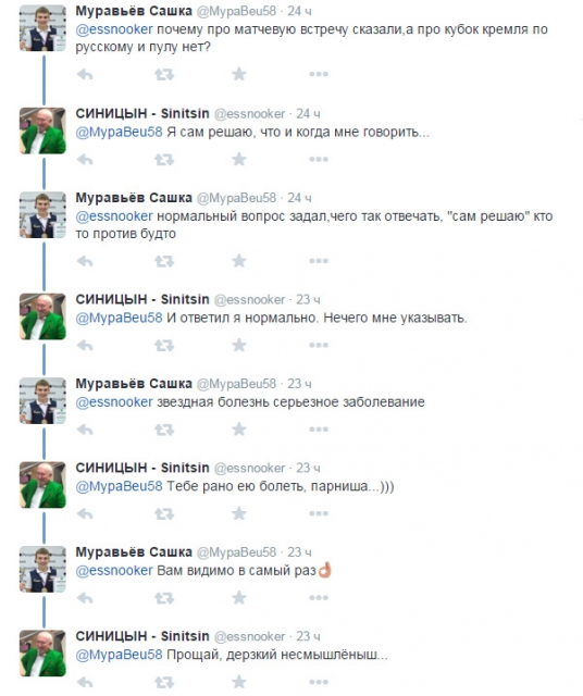 Рекомендую углУбиться;)) в чтение твиттера мистера Синицына. Там еще и не то можно вычитать ,проводник умной игры не стесняется в выражениях. А на ТВ он вынужден в рамках держаться. Евроспорт бизнес,как и все остальное, и его бенефициарам личные предпочтения г-на Синицына без разницы, им аудиторию терять не нужно:)) Ищите,если хотите, а коли будет нужда я сам все это обнародую., в том числе и площадную брань в адрес женщины. ГУГЕЛЬ помнит всё :))