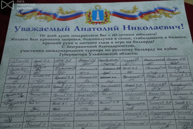 На открытии от имени и за подписью всех участников представительного турнира Анатолию Николаевичу Кочкову был вручен портрет кисти мордовского живописца и бильярдиста Тимофея Арбузова. Анатолий Николаевич был очень растроган таким дорогим во всех отношениях подарком, и, я уверен, эта картина маслом займет достойное место в доме хорошего человека, коим мы все и считаем «Кэпа» Кочкова.