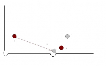 Собственно играли в колхоз. Играю биток(1) через лоб в прицельный(2) с правым винтом в центральную лузу. Биток после соударения делает прокат и от дальней губы выходит в положение 3 , прицельный в положение 4.