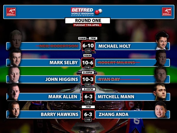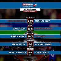В двух встречах сыграны первые сессии. Пока фавориты чувствуют себя довольно уверенно. С одинаковым счетом 6:3 Марк Аллен выигрывает у Митчелла Манна, а Барри Хокинс – у Анда Чзана.