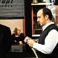 Виджай выигрывает раскат и забивает с разбоя, оценивает позицию и заколачивает три чужих подряд в одну и ту же угловую лузу, затем складывает еще три, после чего выполняет прекрасный удар, вызывавший овации в зале, разведя чужой и свояк по противоположным центральным лузам. Счет стал 7:0, но на последнем шаре Дрангой ошибается, и Александр подходит к столу. Сильнымм ударами в своем стиле забивает два свояка и чужой, но на четвертом шаре, свояке в угол, его серия прерывается. Виджай пробует забить чужой через весь стол, но ошибается, снова предоставляя Паламарю шанс. Харьковчанин забивает прекрасный свояк в центр и выводит шар под чужого в угол. Шар в лузе, но играть нечего. Отыгрыш, счет 7:5 в пользу Виджая. Ответный отыгрыш, после которого Паламарь забивает еще один шар. Встал прямой чужой, на котором Александр довольно неожиданно ошибается, и Виджай заканчивает партию отличным свояком в угол. 1:0 в пользу представителя Молдовы в матче до 7 побед.