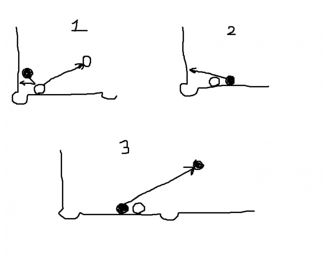 Человек наносит удар по прицельному шару, стоящему на борту на оттяжке. Ни один шар не делает 2 борта или борт-перекат.(рис1)