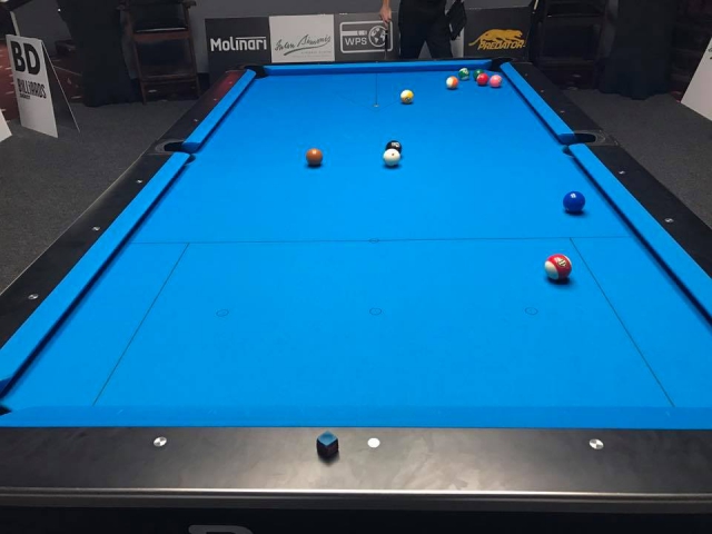 Хорошая новость номер один: из Нью-Йорка ведутся бесплатные интернет-трансляции. Ко второму турниру, который получил название Masters Championship, организаторы заручились поддержкой одного из популярнейших стриминговых сервисов UNILAD (их страница на Facebook имеет 18 миллионов подписчиков, охват аудитории их сайта составляет 32 миллиона уникальных посещений в месяц, а общее количество просмотров их видеоматериалов - более 3 миллиардов ежемесячно). Соответственно, в клубе выделено пространство для главного ТВ-стола, прозванное UNILAD Arena, и матч с участием Руслана Чинахова (очевидно, как первого чемпиона серии) проходил именно на этой "арене". Россиянин стабильно вел в счете 2 партии, но к концу выпустил из рук нити управления игрой и позволил оппоненту - греку Гиауракису - сравнять счет, сделав его 8-8. "Контровая" на WPS, как известно, не проводится - вместо нее соперники выполняют буллиты из заранее известных позиций (см. обозначенные отметки на фото). Гиауракис провел свою серию точнее.