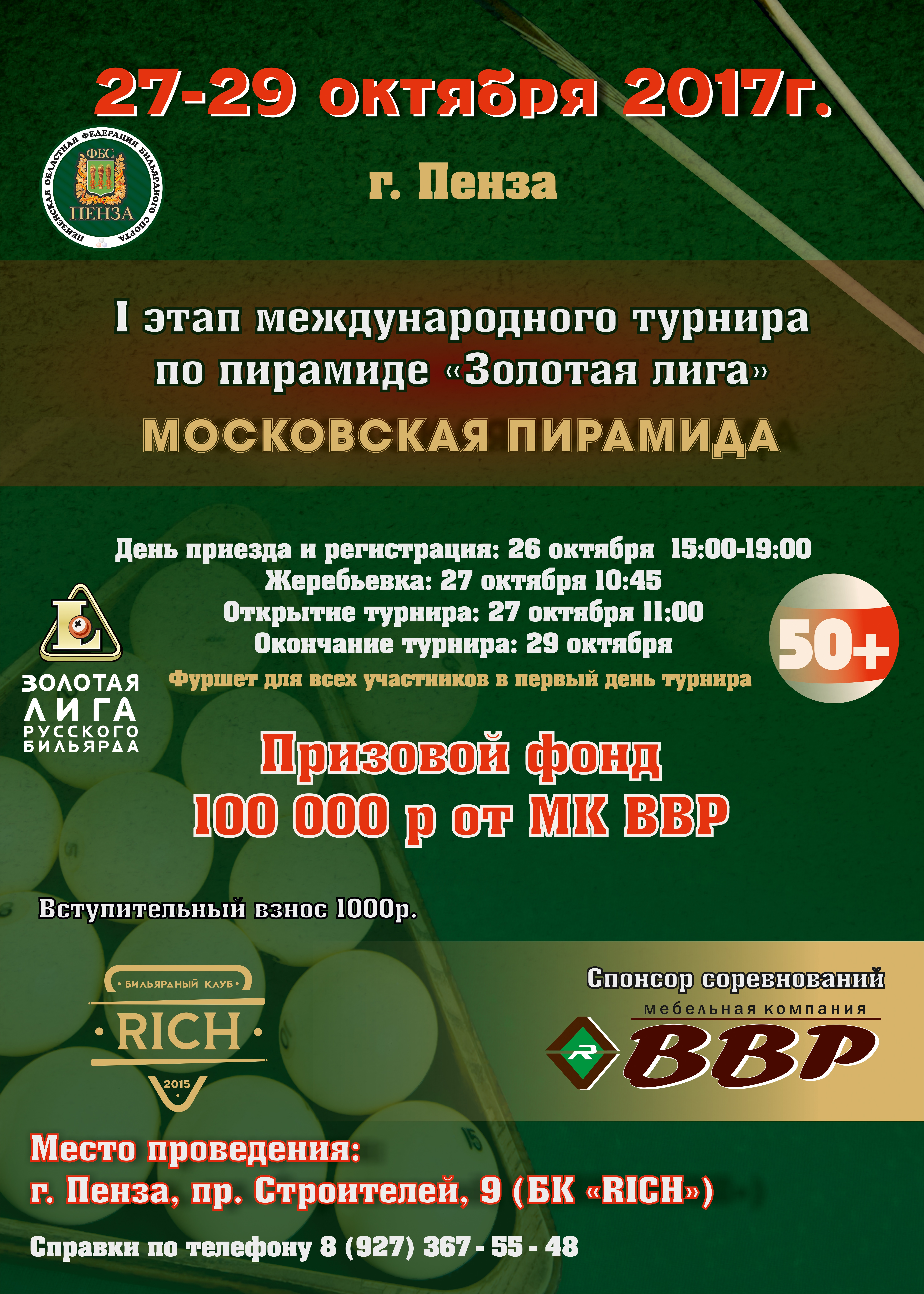 Пенза 2017. 1-й тур международного турнира по пирамиде «Золотая лига (50+)» открытие сезона 2018 19.09.2017 - 12:17 Автор: yasinetskiy Турнир: Пенза 2017. 1-й тур международного турнира по пирамиде «Золотая лига (50+)» открытие сезона 2018