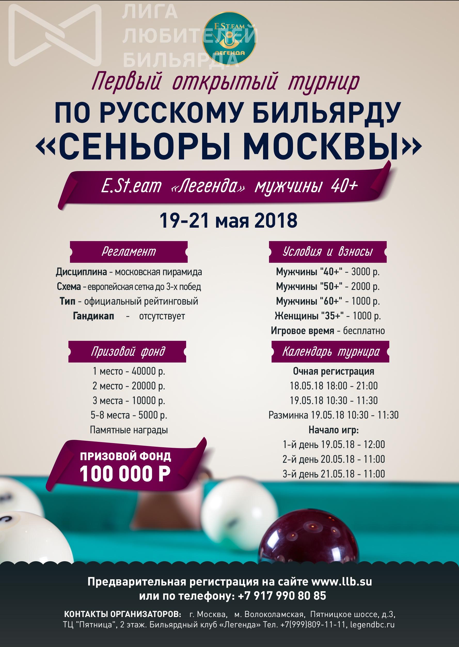 1-й открытый турнир по русскому бильярду «СЕНЬОРЫ МОСКВЫ - E.St.eam 08.05.2018 - 18:27 Автор: Пешев Вадим Турнир: 1-й открытый турнир по русскому бильярду «СЕНЬОРЫ МОСКВЫ - E.St.eam "Легенда". МУЖЧИНЫ 40+»