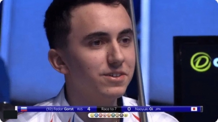 Россиянин выступал во втором матче стартового дня турнира, и его разбои не были слишком успешными, но, несмотря на это, своего японского оппонента Наоюки Ои Горст уверенно переигрывал. И перепрыгивал - в буквальном смысле: уже к 4-й партии Фёдор во всей красе и эффективности продемонстрировал свой знаменитый навык владения ударами перескоком. Дело довершила блестящая по исполнения атака 6-го шара по длинному борту мимо средней лузы.