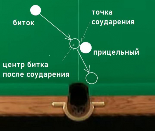 Для лучшего понимания усложним позицию, «передвинув» точку соударения вправо. Так вот, до тех пор, пока центр битка в момент соударения будет находиться на левой стороне, биток после соударения будет перекатывать через середину, и штрафа не будет!