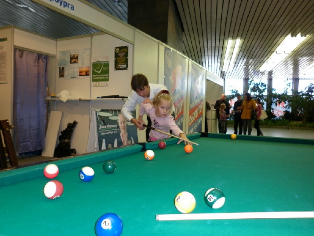 По традиции мы проводили обучение основам бильярдной техники, а Александра Куплянкина - секретарь ФБС - записывала желающих в бесплатные бильярдные школы.