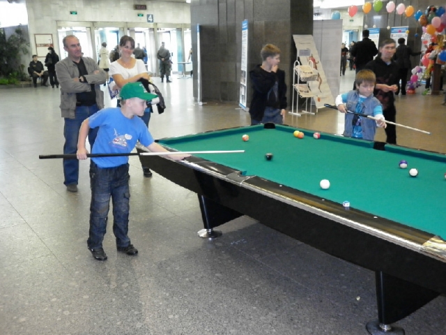 Большой интерес вызвали конкурсы на призы компании "Бильярд-Сервис", в которых юным петербуржцам, первый раз держащим кий в руках, предлагалось попасть битком по мелку, стоящему на середине короткого борта. Удивительно, как быстро дети освоились с таким технически сложным видом спорта как бильярд, раз за разом посылая биток в цель.
