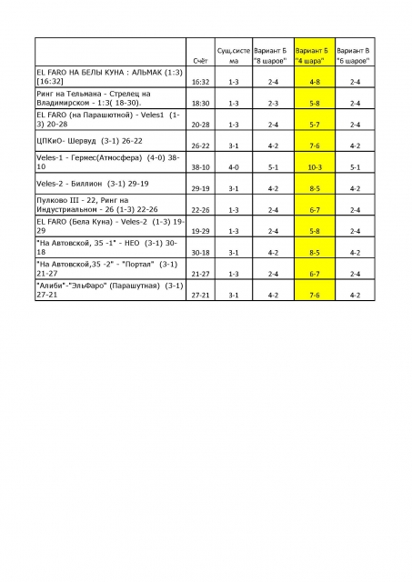 В ней сравнение баллов за одни и те же игры, но по разным системам. Обратите внимание, что при системе "деление на 4шара" соотношение сил в матче "освещается счётом в таблицу" наиболее достоверно. Ценность победы победившей команды в конкретном матче нимало не снижается. А РЕАЛЬНАЯ возможность добавить очков (проиграв матч, но с меньшей разницей) у проигравшей команды при таком подсчёте появляется. А РЕАЛЬНАЯ возможность добавить очков в копилку выигравшей - у выигравшей тоже есть. Да и победа 25-23 (или 27-21, как у некоторых команд в табличке) уже не" 3-1"... а "7-6". И проигрыш, соответственно, не 1-3, а 6-7.