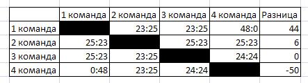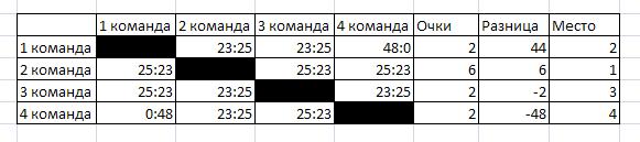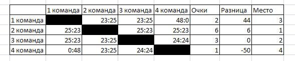 Команда "1" выиграла все 5 матчей, все с одинаковым счетом 25:23 . т.е. в каждом матче набирала 7 баллов, умножаем на 5 = 35 баллов.