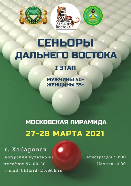 Двухдневный турнир состоится в БК «Спортивный клуб бильярда» (Амурский бульвар, 43). Подтверждение регистрации в клубе 27 марта с 10-00 до 11-00. Взносы участников: 40-59 лет — 2000 р, мужчины «60+» и женщины «35+» — 1000 р. Призовой фонд турнира формируется из 100% взносов участников.
