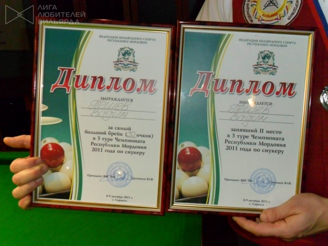Брейк слабенький, но это не предел!Первая встреча турнира между Вадимом Пешевым и Владимиром Кажаевым ознаменовалась первым серьезным для Мордовии :) брейком в 30 очков в исполнении Вадима Пешева, который так и не был перебит в ходе турнира (было несколько брейков по 17 в исполнении Пешева и Филимонова, а также Филимонов делал 24).