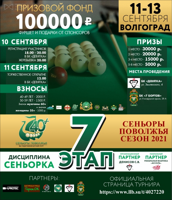 «Сеньоры Поволжья» http://www.llb.su/node/3063793. Координатор: Вадим Пешев (Саранск, +79179908085). 11 сентября сеньоры и сеньориты приглашаются в Волгоград на 7 этап турнирной серии «Сеньоры Поволжья 2021».