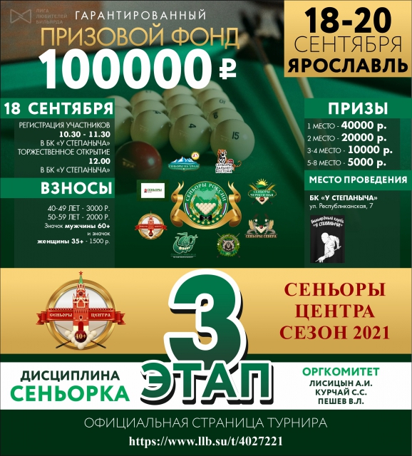 «Сеньоры Центра» https://www.llb.su/node/3106613. Координатор: Андрей Дубарев (Москва, +79260473401). 18 сентября сеньоры и сеньориты центрального дивизиона сеньорского движения, а также гости из других дивизионов, приглашаются в Ярославль на 3 этап турнирной серии «Сеньоры Центра 2021».