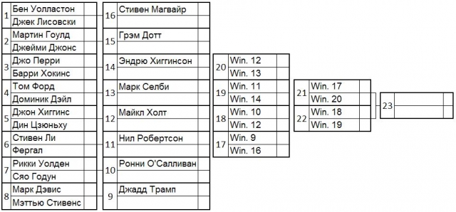17. Мэттью Стивенс — 9 600; 18. Сяо Годун — 9 100; 19. Фергал О'Брайен — 8 000; 20. Дин Цзюньху — 7 600; 21. Доминик Дэйл — 7 600; 22. Барри Хокинс — 7 600; 23. Джейми Джонс — 7 300; 24. Джек Лисовски — 7 100. |