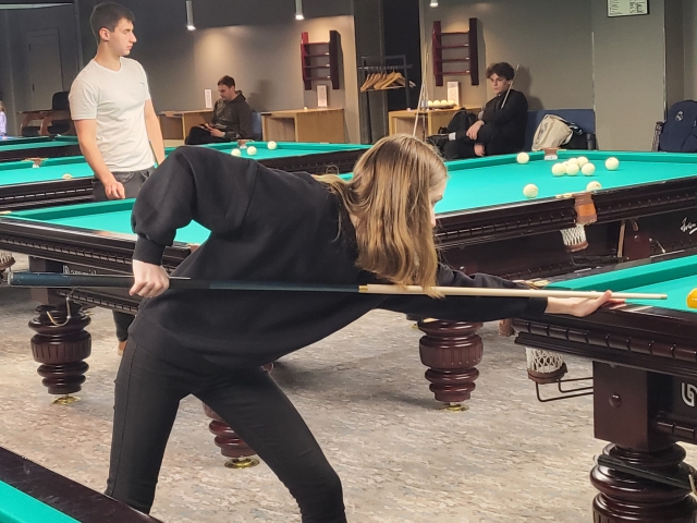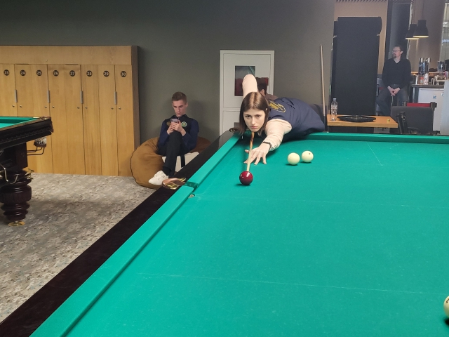 Спортсменки СПбГАСУ искренне поддерживают друг друга. Каждый раз. когда соперница попадает в лузу, слышатся одобрительные щелчки.