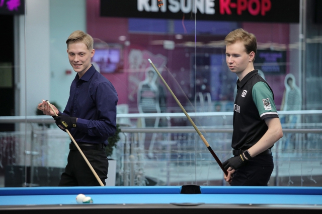 Неподалеку за 3 столом полуфинальную игру проводили Егор Музыка и Тимофей Иглаков. Разбив пирамиду и выбрав свои шары, игроки постепенно перешли к неудобной позиции. 3 шара Егора прижаты к короткому борту, а единственный шар Тимофея прижат к длинному.