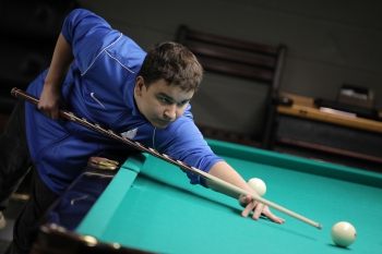 11:43 — Игорь Кирк и Павел Ганин обыграли команду СПбГХФУ за 15 минут. Матч закончился со счетом 2:0 в пользу команды ИТМО. Теперь спортсменам предстоит сыграть против участников из СПбГУПТД. Первая партия за ИТМО. Соперники поняли, что расслабляться нельзя и во второй партии начали собирать по серии шаров. В конце, спортсменам из СПбГУПТД осталось забить всего один шар, что они и сделали. Победа во второй партии за ними.