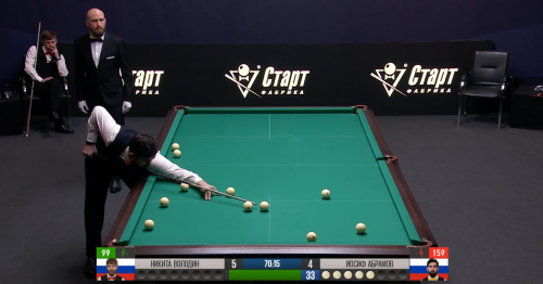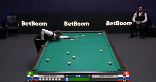 Неточный разбой Абрамова, только три шара от Володина. Теряет на глазах контроль матча Никита. Нет — только один шар в ответ от Иосифа. Володин забирает партию, 10:8. И снова результативный разбой! Не везёт на седьмом — чужой выскочил, свояк не поместился.