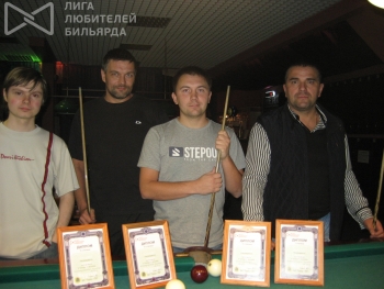 Финал есть финал и легкой борьбы здесь не ожидалось. Первая партия за Александром. Во второй вверх одерживает Андрей. Контровая партия идет шар в шар. Причем перевес переходит то в одну,то в другую сторону. При счете 4:4 Андрей делает красивую серия и счет становиться 7:4. Восьмого шара Андрею не пришлось забивать. Он ставит биток в лузу,да так глубоко,что Александру ничего не осталось делать,как выполнить удар со штрафом. Очень красивая победа Андрея Гусева! Поздравляем!