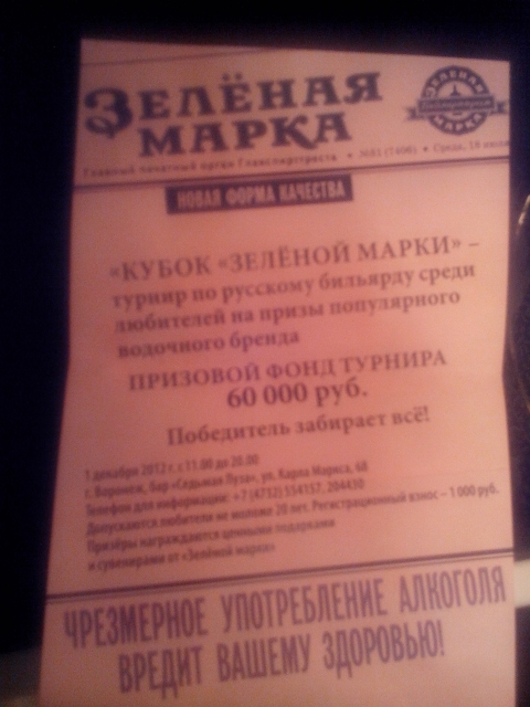 Да, турнир конечно интересный...Так сказать для галочки рук-ву Зеленой марки, мол провели, мол любители, но вот только проскакивают туда не любители совсем, а игроки даже не имеющие всяких там званий, но играющие в КОММЕРЧЕСКИЙ бильярд...водка их не берет, куш большой совсем не давит на психику..