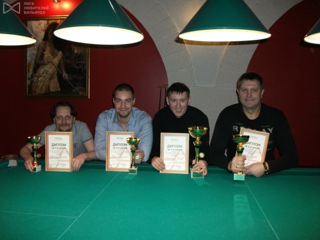 (Счастливые обладатели денежных призов от спонсоров, дипломов от ЛЛБ и кубков от организатора – Ассоциации банков Северо-Запада. Впереди, в суперфинале, главный приз – кий Longoni Russa).