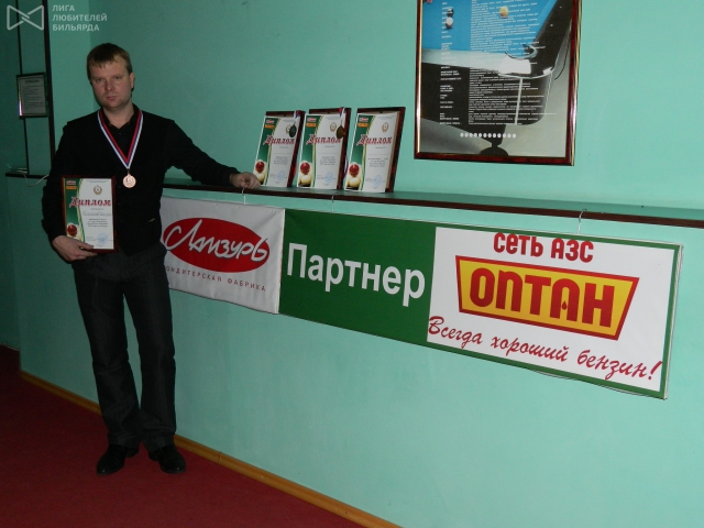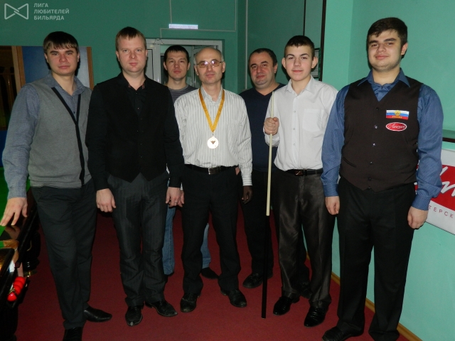 Именинник Головкин А. перед турниром с памятной медалью в кругу друзейИ вот уже на первом турнире – Чемпионате Республики Мордовия 2013 года, прошедшем в СК «Мордовия» в минувшие выходные, принял участие самый талантливый воспитанник Вагана Барсеговича 15-летний Аберхаев Абдулхай, который быстрее всех освоил азы снукера, имея опыт игры на русском бильярде.