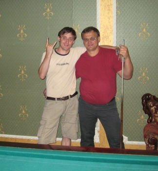 Уже через несколько часов - самолёт. Сегодня встретились с Виталиком в 3-й раз: помимо "Дуплетов" играли в Классическую пирамиду (до 71 очка). Не смотря на какое-то нереальное количество дуплетов, забитых мне перед этим, я всё-таки дал бой крепкой 1-ке (по ЛЛБ-шным меркам). Первую партию выиграл весьма убедительно, набрав более 80 очков, а вот 2-ю проиграл в последнем шаре, уронив свояка по отыгрышу от борта (когда надо - оно ж хрен упадёт!!!).