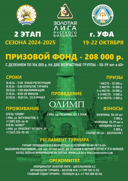Турнир проводится 19-22 октября 2024 г в БК «Олимп» по адресу: Республика Башкортостан, г. Уфа, ул. Ю. Гагарина, д. 1/3, 5 этаж.